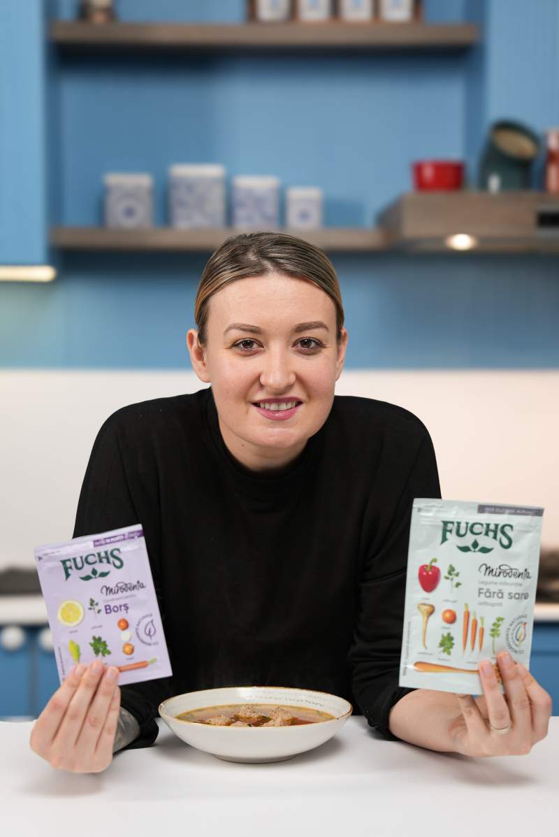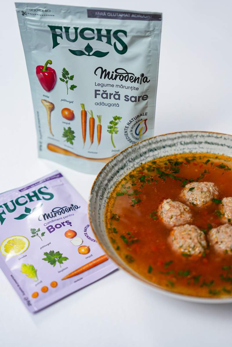 Pentru nota acrișoară specifică unei ciorbe autentice, am adăugat o linguriță de Mirodenia Borș Fuchs, care împrospătează tot preparatul și îi oferă acea savoare tradițională, fără să fie nevoie de borș lichid.